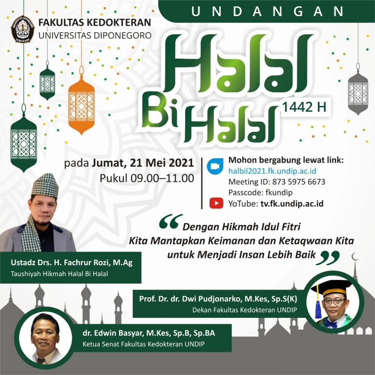 Bersama ini kami sampaikan undangan kegiatan Halal Bihalal civitas Fakultas Kedokteran Universitas Diponegoro pada hari Jumat tanggal 21 Mei 2021 secara daring melalui Aplikasi Zoom.